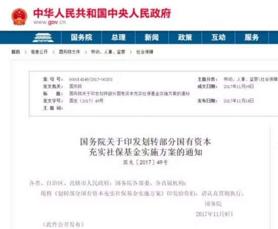 18日,国务院印发了《划转部分国有资本充实社保基金实施方案》。《方案》指出,为充分体现代际公平和国有企业发展成果全民共享,现决定划转部分国有资本充实社保基金。