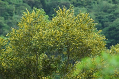 相思树,为豆科常绿乔木,一般称“相思仔”或“假叶豆”。宝岛以竹苗一带栽种最多,为著名的薪炭材。初夏进入花期的相思树,小黄花逐渐将细长的绿叶包围,到盛夏只见满花几不见绿叶,颇有几分秋日枫红味道,落地黄花也很浪漫。