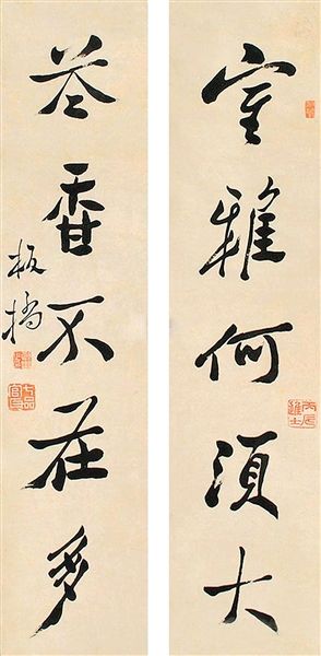 郑板桥作品中,和《难得糊涂》相对应的书法,还有一幅是《吃亏是福》。但是这两幅字的艺术处理手法完全不一样:《吃亏是福》处理很保守,比较笨拙,可能作者认为老实人容易吃亏,而这种吃亏恰恰是智慧。从中我们可以窥见,针对不同内容,郑板桥会采用不同的艺术手法,极有匠心。郑板桥也有很多对联,写得虽然很怪,但是很雅。例如“室雅何须大,花香不在多”,还有“删繁就简三秋树,领异标新二月花”,大小跌宕,非常漂亮。