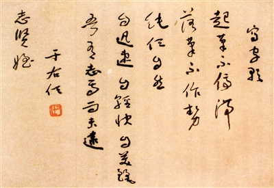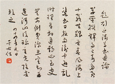 晚年在台湾于右任先生有《写字歌》,说写字之要诀是:“起笔不停滞,落笔不作势,纯任自然,自迅速,自轻快,自美丽。吾有志焉而未逮。”这首歌也是于右任先生自己对书法的终极觉悟。至此境界,则会将胸中、笔下之积淀于下笔之一瞬间自然涌泄而出,“自然”、“迅速”、“轻快”、“美丽”。虽然绝不刻意作书,而其所成之墨迹一定是活笔、活势,是率意无意之翰墨至宝。